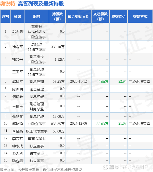 奥锐特的高管列表及最新持股情况如下: