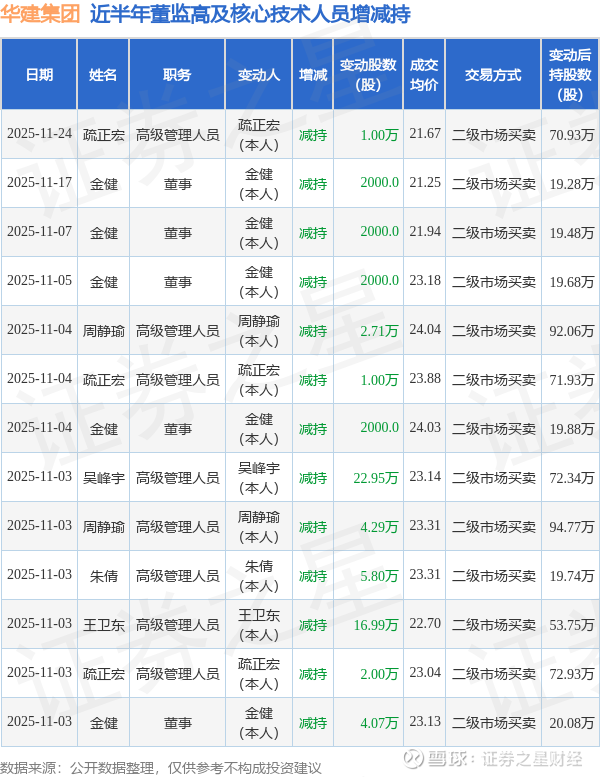 华建集团近半年内的董监高及核心技术人员增减持详情如下: