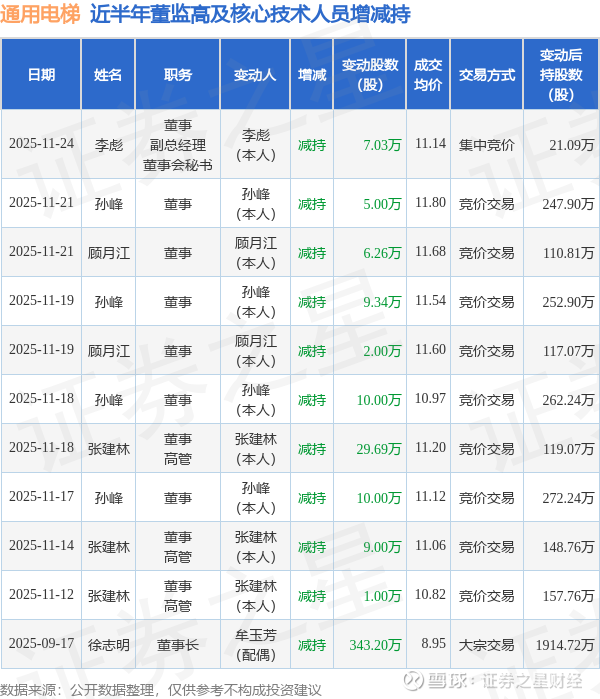 通用电梯近半年内的董监高及核心技术人员增减持详情如下: