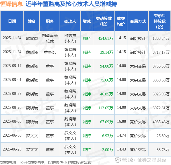 恒锋信息近半年内的董监高及核心技术人员增减持详情如下: