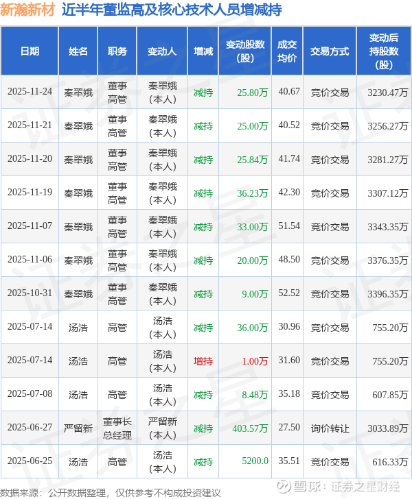 新瀚新材近半年内的董监高及核心技术人员增减持详情如下: