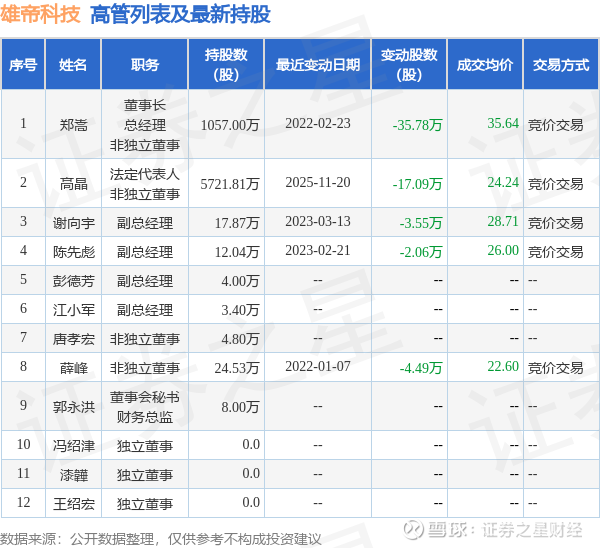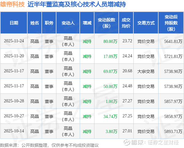 雄帝科技近半年内的董监高及核心技术人员增减持详情如下: