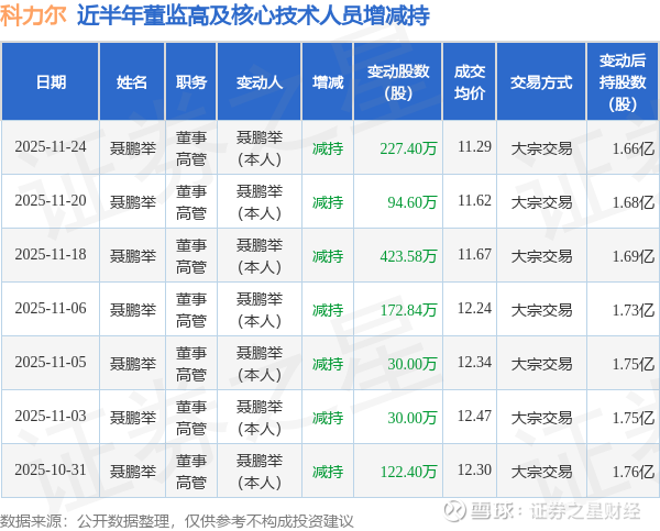 科力尔近半年内的董监高及核心技术人员增减持详情如下: