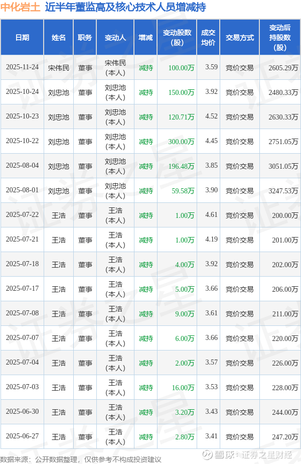 中化岩土近半年内的董监高及核心技术人员增减持详情如下: