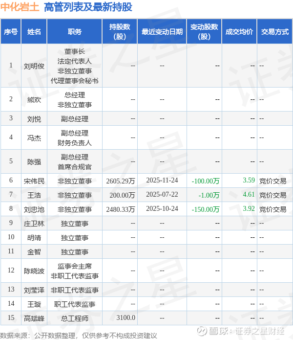 中化岩土的高管列表及最新持股情况如下: