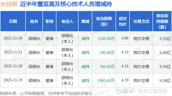 证券之星消息,根据11月25日市场公开信息、上市公司公告及交易所披露数据整理,大北农(002385)最新董监高及相关人员股份变动情况:2025年11月24日公司董事邵根伙共减持公司股份1220.0万股,占公司总股本为0.2837%。变动期间公司股价下跌0.49%,11月24日当日收盘报4.06元。