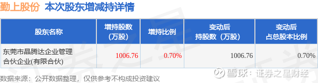 证券之星消息,11月25日勤上股份发布公告《勤上股份:关于公司第一大表决权持有人首次增持公司股份及后续增持计划暨权益变动触及1%的公告》,其股东东莞市晶腾达企业管理合伙企业(有限合伙)于2025年11月25日合计增持1006.76万股,占公司目前总股本的0.7008%,变动期间该股股价上涨10.11%,截止11月25日收盘报3.05元。