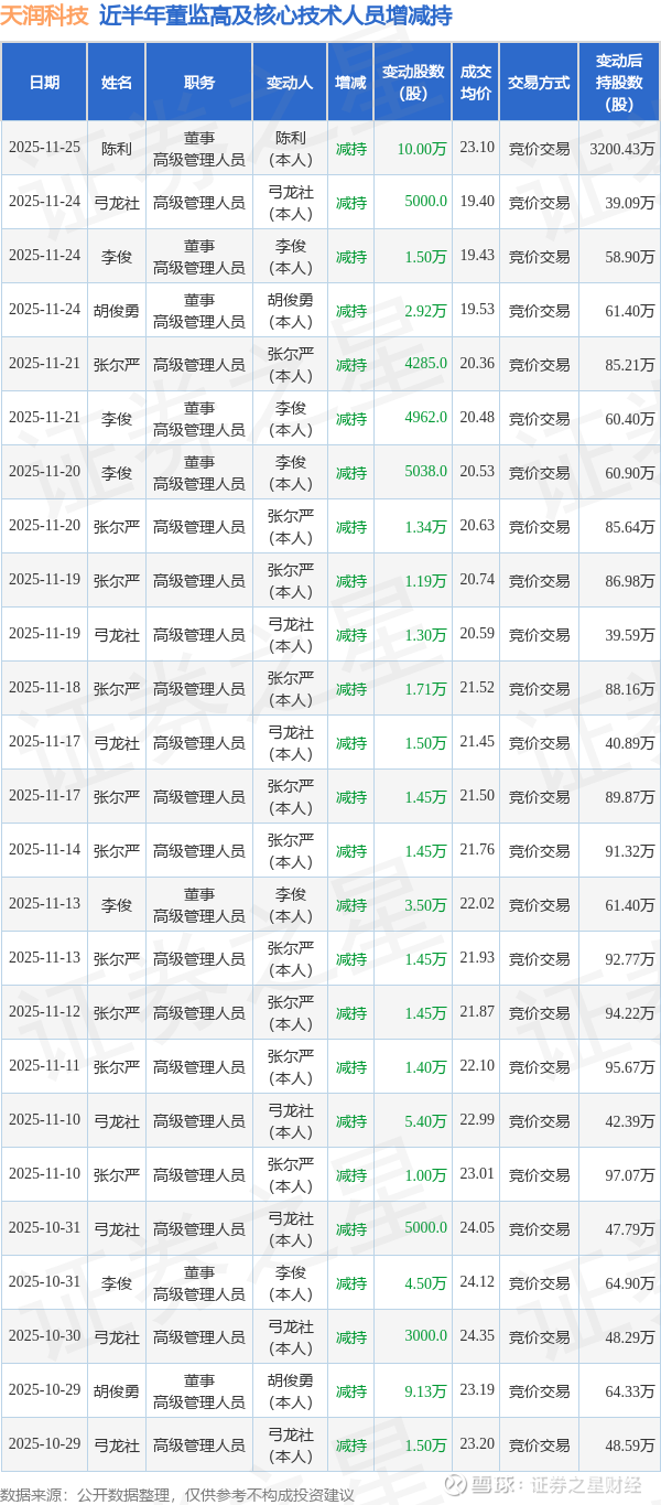 天润科技近半年内的董监高及核心技术人员增减持详情如下: