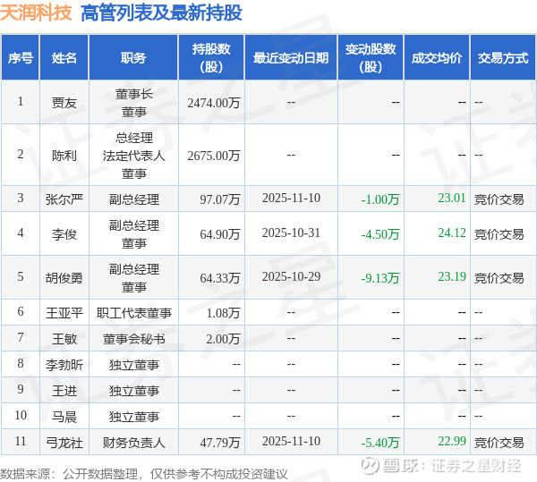 证券之星消息,根据11月26日市场公开信息、上市公司公告及交易所披露数据整理,天润科技(920564)最新董监高及相关人员股份变动情况:2025年11月25日公司董事,高级管理人员陈利共减持公司股份10.0万股,占公司总股本为0.1123%。变动期间公司股价上涨14.73%,11月25日当日收盘报22.51元。