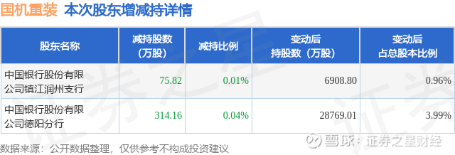 证券之星消息,11月26日国机重装发布公告《国机重装:国机重装关于合计持股5%以上股东及其一致行动人减持计划实施完毕暨减持结果的公告》,其股东中国银行股份有限公司镇江润州支行、中国银行股份有限公司德阳分行于2025年11月15日至2025年11月24日间合计减持389.98万股,占公司目前总股本的0.0541%,变动期间该股股价下跌8.08%,截止11月24日收盘报3.3元。