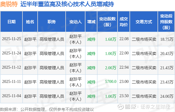 奥锐特近半年内的董监高及核心技术人员增减持详情如下: