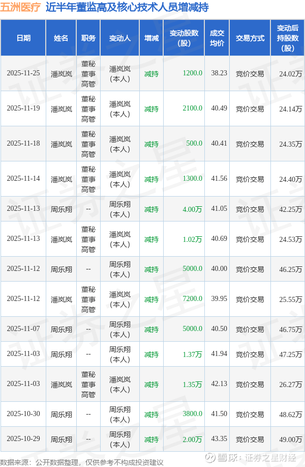 五洲医疗近半年内的董监高及核心技术人员增减持详情如下: