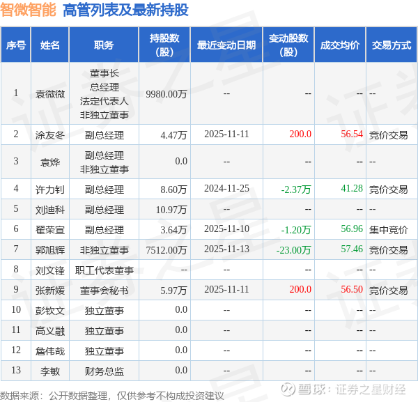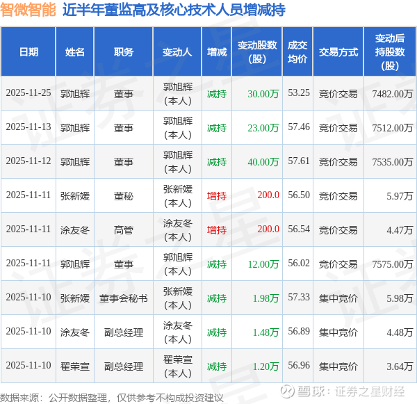 智微智能近半年内的董监高及核心技术人员增减持详情如下: