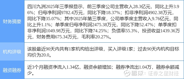 2025年9月25日,中航证券研究员梁晨,张超,闫政圆发布了对四川九洲的研报《2025年中报点评:军民空管装备领军企业,积极布局低空经济新赛道》,该研报对四川九洲给出“买入”评级,认为其目标价为20.0元,现价距离目标价尚有22.17%的涨幅空间。研报中预计公司2025-2027年的营业收入分别为43.92亿、54.73亿元和61.18亿元,归母净利润分别为2.21亿元、3.04亿元和3.68亿元,EPS分别为0.22元、0.30元和0.36元,我们给予“买入”评级,目标价20.00元。证券之星数据中心根据近三年发布的研报数据计算,该研报作者对此股的盈利预测准确度为44.44%。