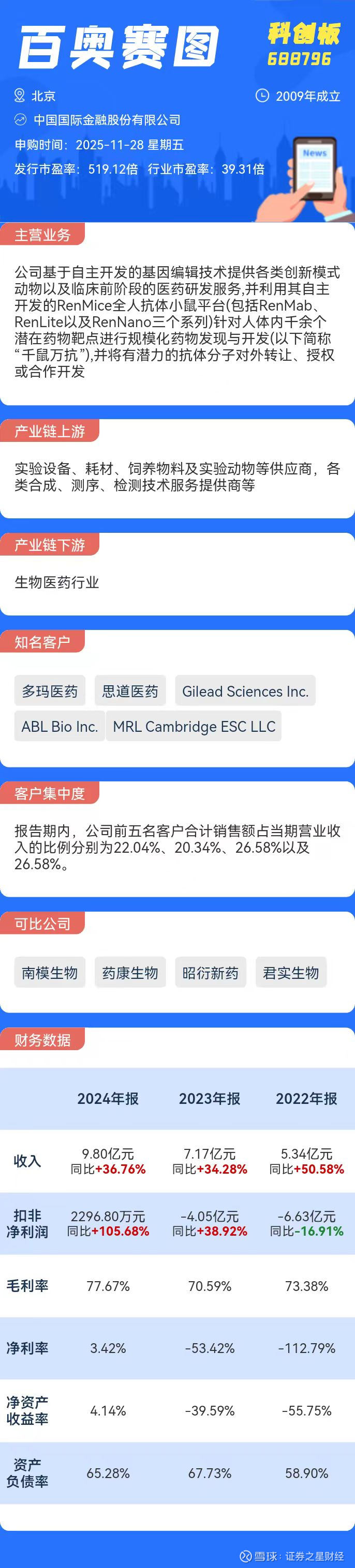 从估值看,公司目前盈利规模尚小,发行市盈率超过500倍,在近期新股中较为罕见,但考虑到公司的科技属性,及近一年多新股首日赚钱效应明显,综合判断百奥赛图首日破发概率较小。