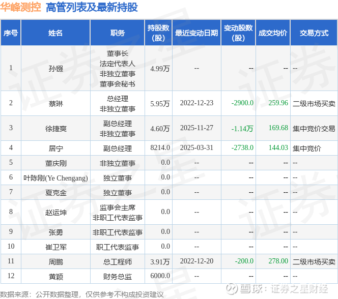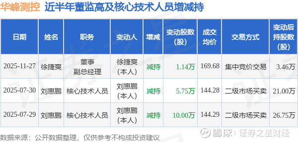 华峰测控近半年内的董监高及核心技术人员增减持详情如下: