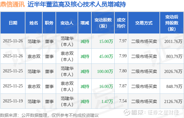鼎信通讯:11月26日高管范建华、袁志双减持股份合计60万股