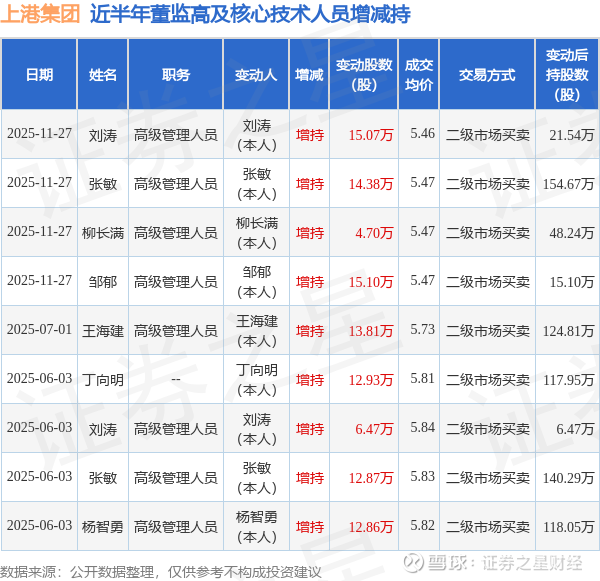 上港集团近半年内的董监高及核心技术人员增减持详情如下: