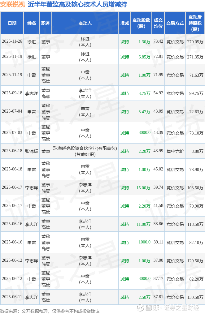 安联锐视近半年内的董监高及核心技术人员增减持详情如下: