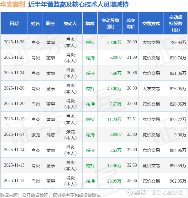 证券之星消息,根据11月27日市场公开信息、上市公司公告及交易所披露数据整理,华安鑫创(300928)最新董监高及相关人员股份变动情况:2025年11月26日公司董事肖炎共减持公司股份20.8万股,占公司总股本为0.26%。变动期间公司股价上涨0.03%,11月26日当日收盘报30.95元。