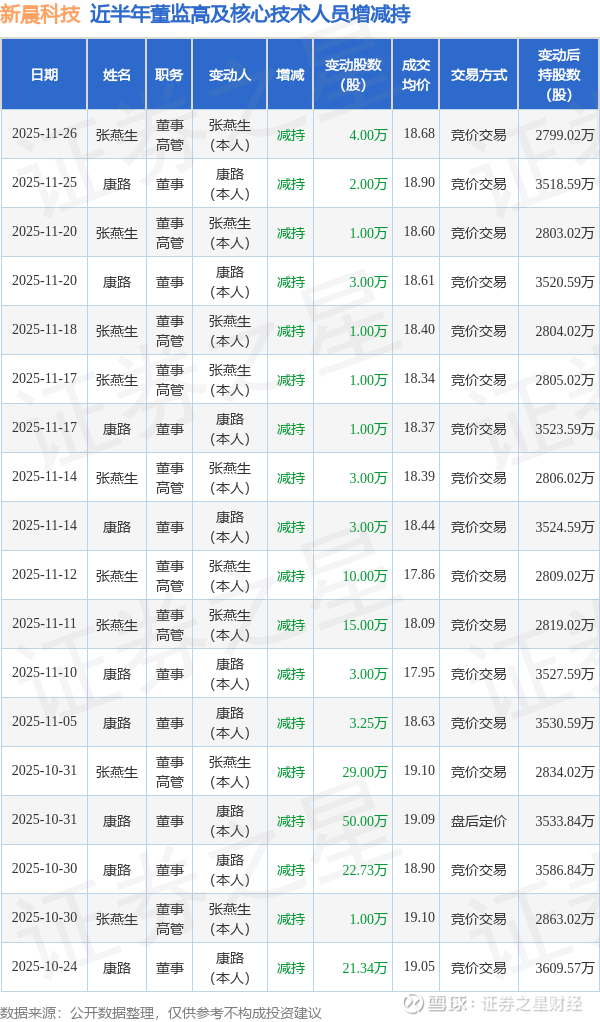 新晨科技近半年内的董监高及核心技术人员增减持详情如下: