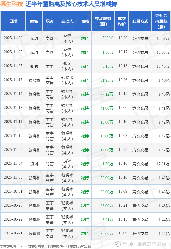 德生科技近半年内的董监高及核心技术人员增减持详情如下: