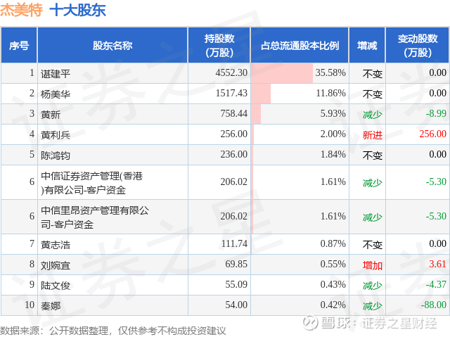 根据杰美特2025年三季报公布的十大股东详情如下: