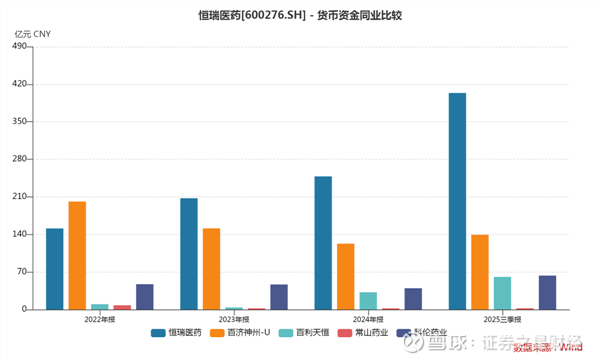 行业领先的盈利能力给恒瑞医药带来的最直接体现就是货币资金逐年增加。2025年前三季度,恒瑞医药的货币资金来到403.6亿元。同比增长82.39%。这些大量流动资金的存在给恒瑞医药的高研发提供了较厚的安全垫和确定性。