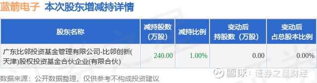 证券之星消息,11月28日蓝箭电子发布公告《蓝箭电子:关于公司股东减持计划完成的公告》,其股东广东比邻投资基金管理有限公司-比邻创新(天津)股权投资基金合伙企业(有限合伙)于2025年11月12日至2025年11月27日间合计减持240.0万股,占公司目前总股本的1.0%,变动期间该股股价下跌7.99%,截止11月27日收盘报20.37元。