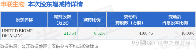 证券之星消息,11月28日申联生物发布公告《申联生物:申联生物医药(上海)股份有限公司简式权益变动报告书》,其股东UNITED BIOMEDICAL,INC.于2025年11月24日至2025年11月28日间合计减持213.54万股,占公司目前总股本的0.52%,变动期间该股股价上涨3.11%,截止11月28日收盘报9.62元。