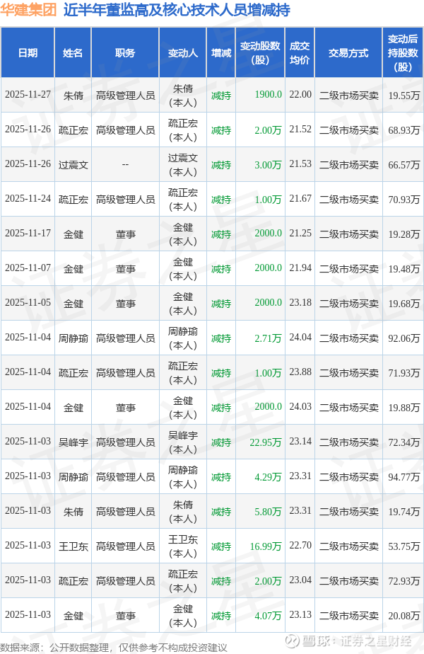 华建集团近半年内的董监高及核心技术人员增减持详情如下: