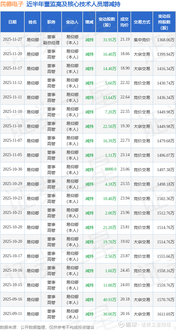 民德电子近半年内的董监高及核心技术人员增减持详情如下:
