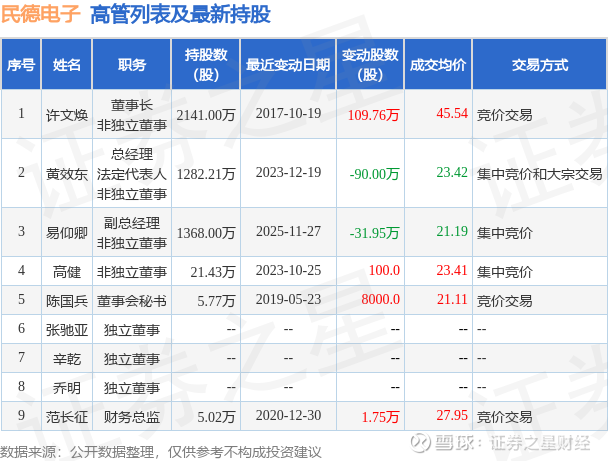 证券之星消息,根据11月28日市场公开信息、上市公司公告及交易所披露数据整理,民德电子(300656)最新董监高及相关人员股份变动情况:2025年11月27日公司董事,副总经理易仰卿共减持公司股份31.95万股,占公司总股本为0.1867%。变动期间公司股价下跌0.14%,11月27日当日收盘报21.09元。