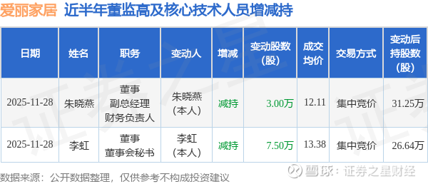爱丽家居近半年内的董监高及核心技术人员增减持详情如下: