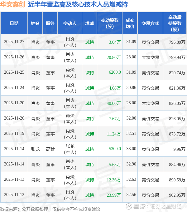 证券之星消息,根据11月28日市场公开信息、上市公司公告及交易所披露数据整理,华安鑫创(300928)最新董监高及相关人员股份变动情况:2025年11月27日公司董事肖炎共减持公司股份3.04万股,占公司总股本为0.038%。变动期间公司股价上涨1.36%,11月27日当日收盘报31.37元。