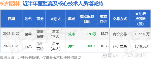 证券之星消息,根据11月28日市场公开信息、上市公司公告及交易所披露数据整理,杭州园林(300649)最新董监高及相关人员股份变动情况:2025年11月27日公司董事,高管葛荣共减持公司股份3.9万股,占公司总股本为0.0295%。变动期间公司股价上涨0.45%,11月27日当日收盘报15.76元。