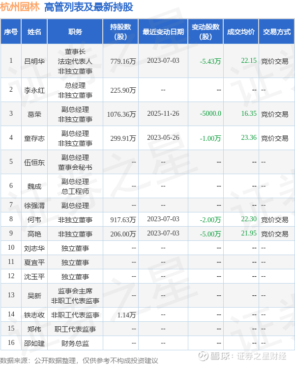 杭州园林近半年内的董监高及核心技术人员增减持详情如下:
