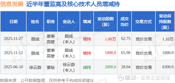 证券之星消息,根据11月28日市场公开信息、上市公司公告及交易所披露数据整理,信息发展(300469)最新董监高及相关人员股份变动情况:2025年11月27日公司董事,高管顾成共增持公司股份1.0万股,占公司总股本为0.004%。变动期间公司股价上涨1.08%,11月27日当日收盘报62.67元。