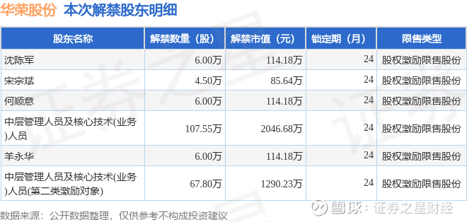 证券之星消息,根据市场公开信息整理,华荣股份(603855)于12月1日将有197.85万股限售股份解禁,为公司股权激励限售股份,占公司总股本0.59%。(本次数据根据历史公告整理得出,实际情况以上市公司最新公告为准)最近一年内,该股累计解禁265.0万股,占总股本的0.79%。本次解禁后,公司还有197.85万股限售股份,占总股本0.59%。具体如下图所示:
