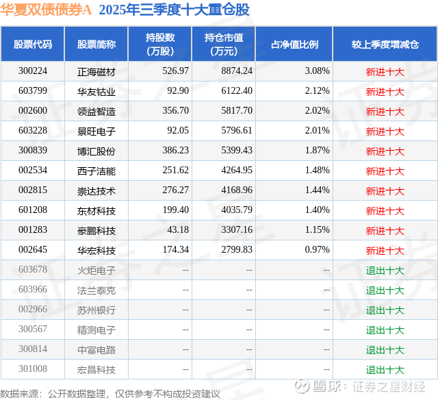 根据2025基金Q3季报公募基金重仓股数据,重仓该股的公募基金共3家,其中持有数量最多的公募基金为华夏基金的华夏双债债券A。华夏双债债券A目前规模为19.09亿元,最新净值2.0446(11月28日),较上一交易日上涨0.51%,近一年上涨17.19%。该公募基金现任基金经理为柳万军。柳万军在任的基金产品包括:华夏纯债债券A,管理时间为2017年9月8日至今,期间收益率为36.17%;华夏永康添福混合A,管理时间为2019年7月15日至今,期间收益率为74.27%;华夏鼎清债券A,管理时间为2020年12月3日至今,期间收益率为16.79%。