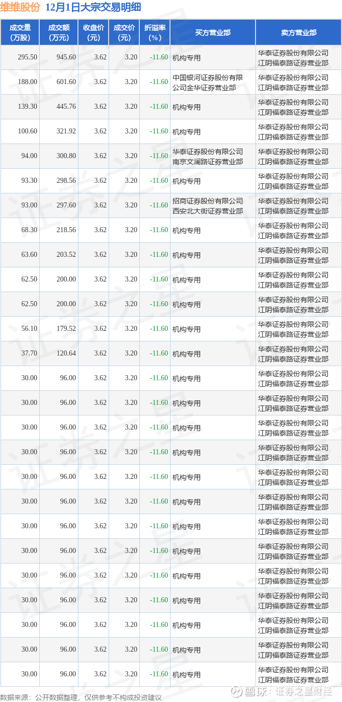 证券之星消息,12月1日维维股份发生大宗交易,交易数据如下: