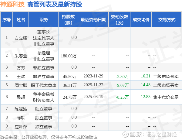 神通科技的高管列表及最新持股情况如下: