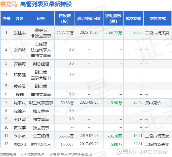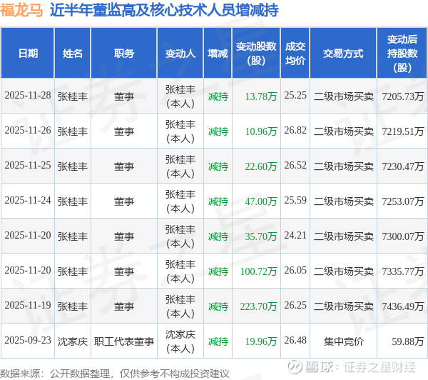 福龙马近半年内的董监高及核心技术人员增减持详情如下: