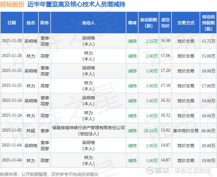 招标股份近半年内的董监高及核心技术人员增减持详情如下:
