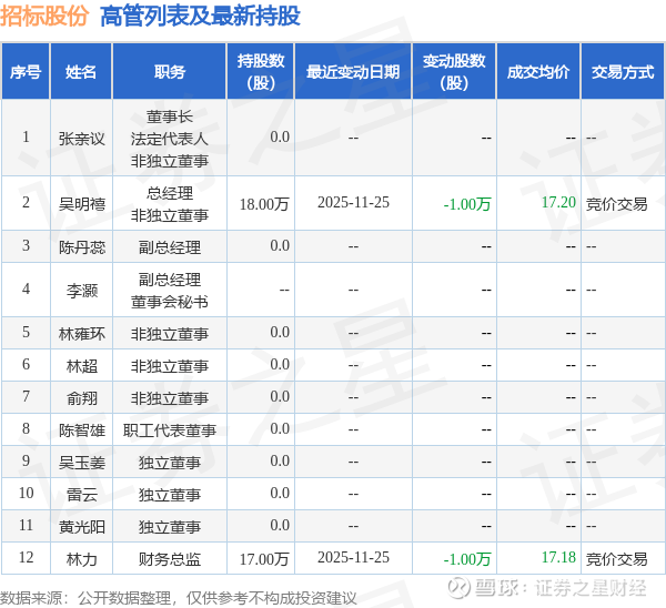 证券之星消息,根据12月1日市场公开信息、上市公司公告及交易所披露数据整理,招标股份(301136)最新董监高及相关人员股份变动情况:2025年11月28日公司董事,高管吴明禧、高管林力共减持公司股份4.25万股,占公司总股本为0.0155%。变动期间公司股价上涨10.2%,11月28日当日收盘报16.96元。