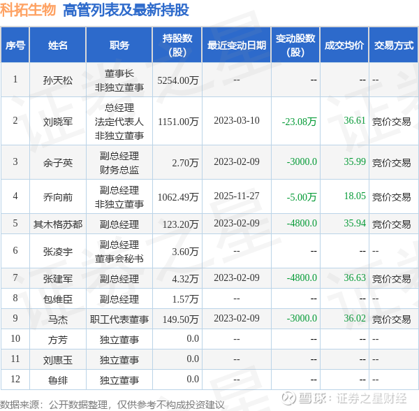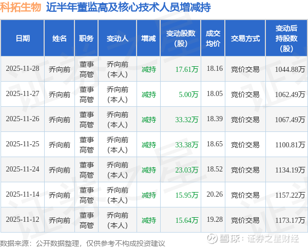 科拓生物近半年内的董监高及核心技术人员增减持详情如下: