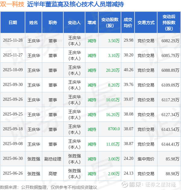 双一科技近半年内的董监高及核心技术人员增减持详情如下: