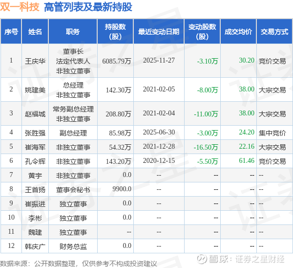 双一科技的高管列表及最新持股情况如下: