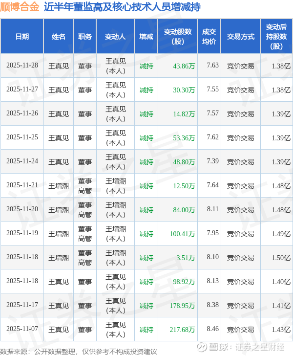 证券之星消息,根据12月1日市场公开信息、上市公司公告及交易所披露数据整理,顺博合金(002996)最新董监高及相关人员股份变动情况:2025年11月28日公司董事王真见共减持公司股份43.86万股,占公司总股本为0.0655%。变动期间公司股价上涨2.41%,11月28日当日收盘报7.65元。