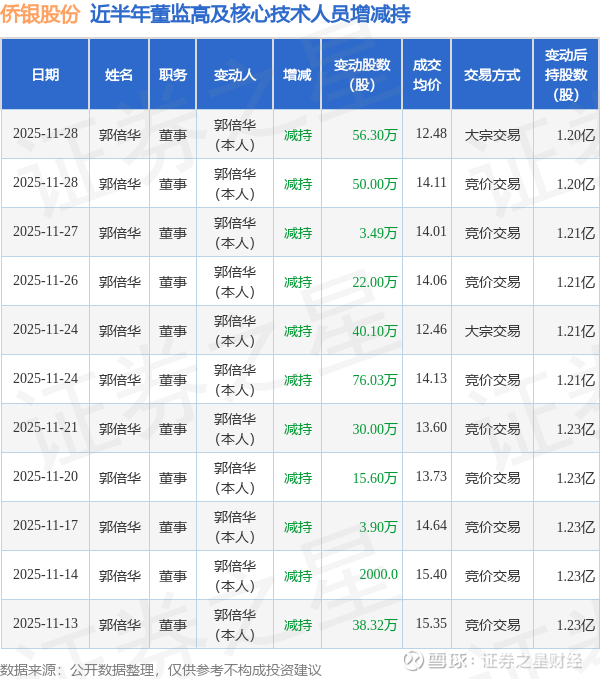侨银股份近半年内的董监高及核心技术人员增减持详情如下: